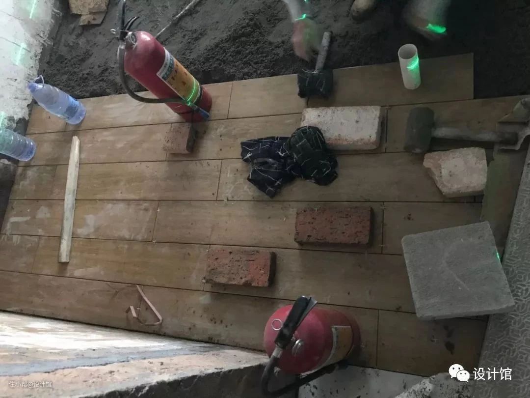 所以木纹砖铺设的时候,为了保持整体平整度,往往都是很费力的事,甚至要用到“压边”的特殊处理——用灭火器、大水瓶压住容易翘起的一端。