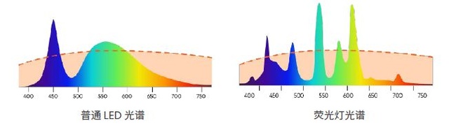 LED光谱中400-555nm(蓝黄绿光波)为高能效波段,这几个波段如果过高会对人眼造成损伤。