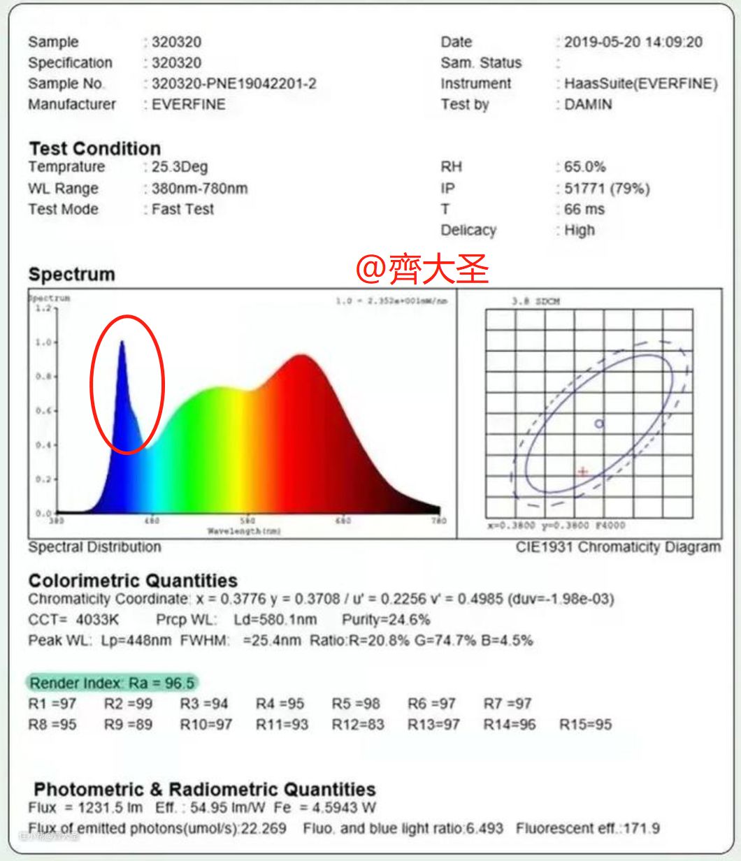 前文已经说过蓝光的问题,普通全光谱灯具目前应用最广泛的蓝光LED 是通过蓝光激发荧光粉形成的白光,它是由一部分原始的蓝光 + 激发的黄光(等价于红光+绿光)混合而成的白光。 在色温升高及亮度升高时,过量的蓝光就无法避免在430nm - 470nm之间的有害蓝光波段形成一个波峰。