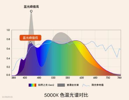 如然之光 Gen2 通过紫光激发的LED:在不同亮度下,如然之光的蓝光比例基本保持不变; 而即使是色温水平调高时如然之光的蓝光能量水平也不会大幅度飙高,相比传统蓝光激发的LED如然之光Gen2的蓝光比例可以低60%。 相比其它竞品全光谱LED蓝光能量也更低。实现了 3000K - 5000K 全域低蓝光的类阳光全光谱。