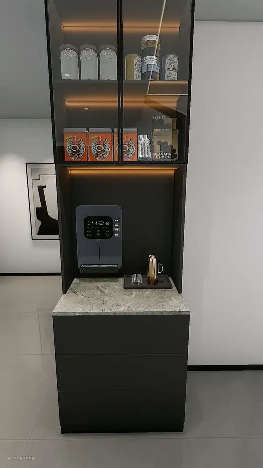 左边做一组矮柜,抽屉收纳小物件,上方再做薄柜,收纳零食干货,中间安装管线机,喝水泡茶更方便。