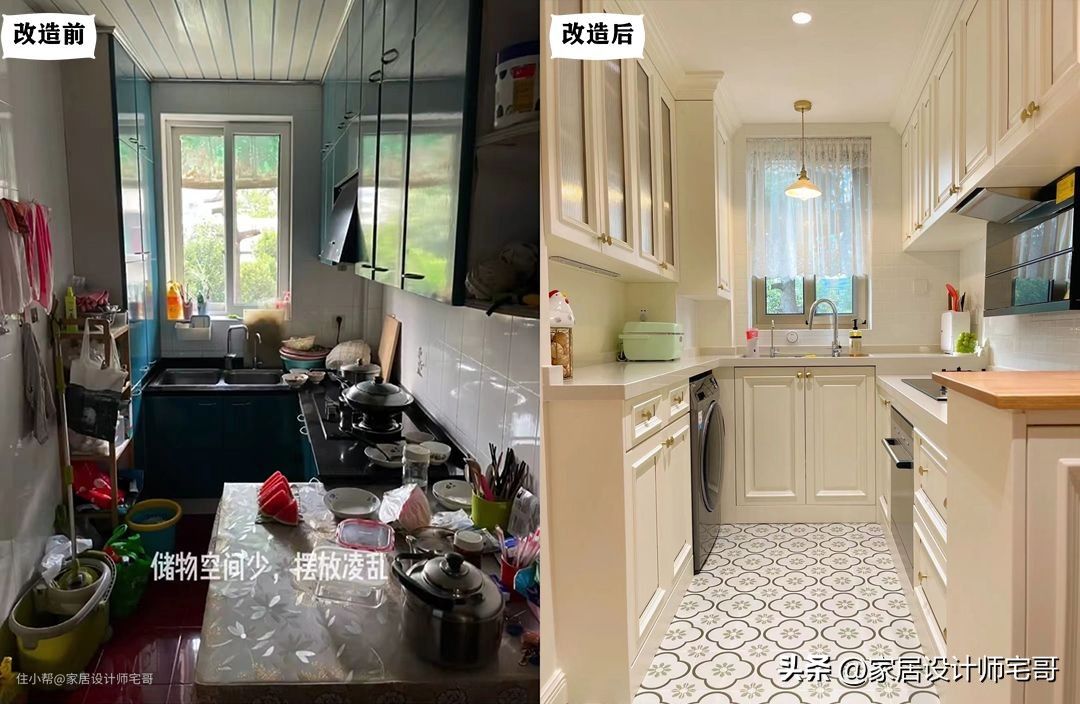 改造以后看起来就宽敞了很多,上下吊柜和橱柜空间很多,为厨房提供了充足的收纳空间,既实用又干净整洁。