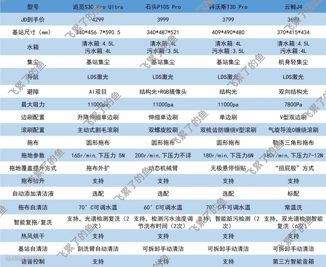 另外,云鲸J4在这张表里算比较醒目的,一是价格最低,二是最大吸力最小,三是不支持热水洗拖布,四是特立独行的采用了机身集尘方式,五是唯一采用双边刷的机型,六是唯一标配自动添加清洁液功能的机型……冷眼一看觉得,云鲸J4特别“非主流”,但作为真实用户,我会告诉你,一直引领扫地机器人发展的云鲸是个实打实的“理工男”,云鲸J4的心思都用在了满足用户需求和解决用户痛点上了,虽然参数不亮眼,功能不花哨,但真的好用,妥妥的3K-4k档位性价比机型。