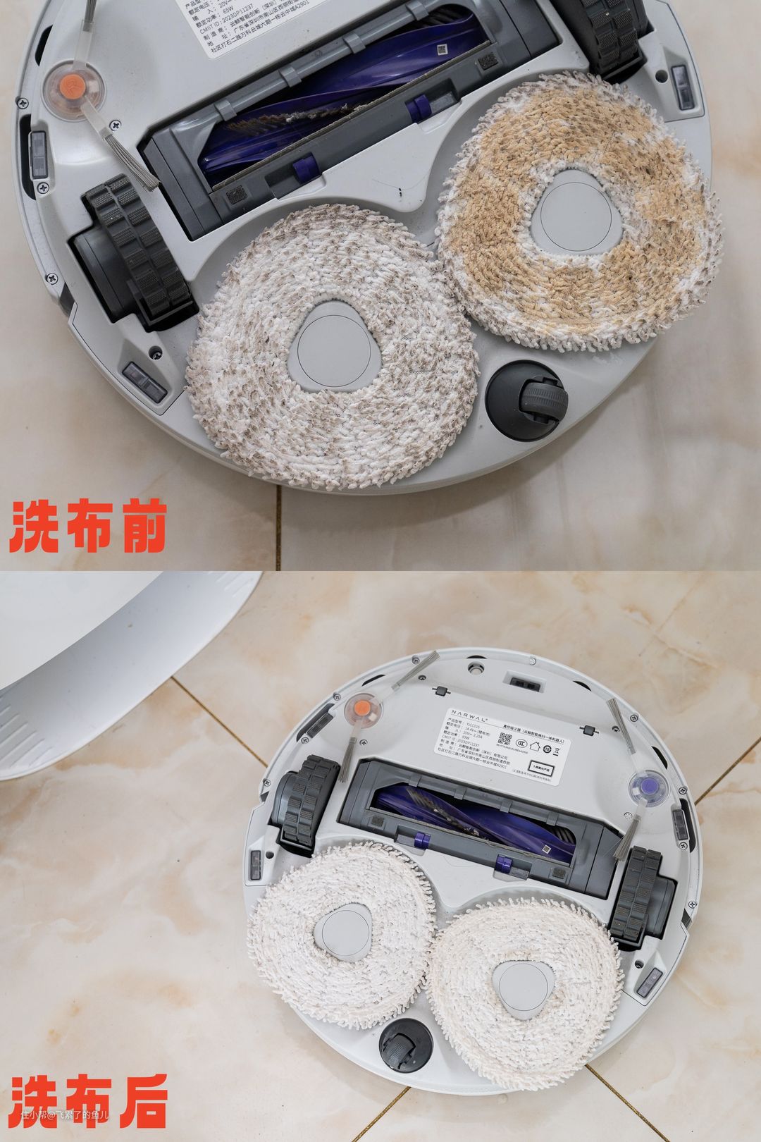 在云鲸J4完成拖地工作回洗的途中,我把它截住了,在一边的拖布上点了很多酱油渍,然后让它继续回洗,洗完之后,基本看不出两边的拖布有什么差异,云鲸托管2.0下的洗布效果,还是蛮靠谱的。无论清洁还是洗布,有了云鲸托管2.0,云鲸J4都能在无人工干预的情况下做到最后,用起来省心不止一点点!