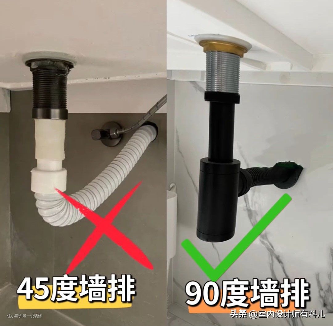墙排下水有45度和90度出墙两种,建议大家做90度墙排,90度的,下水器与下水管紧密相连,密封性好,不会反臭且更美观,更适合盆下没有浴室柜或者悬浮的浴室柜。
