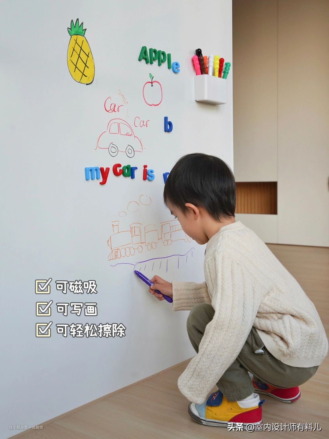 有了这样一面白板墙,孩子也能体验“做老师”的感觉,与家长一起讨论问题时,写在白板上比在纸上更方便,随时可擦可涂改,清晰明了。