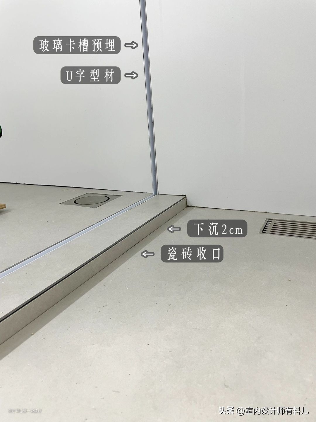 还要提前买好玻璃隔断用的卡槽,墙上和地上都要做卡槽,用来安装玻璃,在贴砖的时候就要进行预埋好。