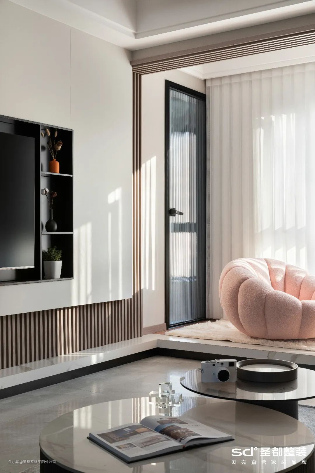 ✔ 比如《日不落》就将阳台一分为二,一部分纳入次卧规划成洗衣房;一部分纳入客厅规划成休闲区。两者以长虹玻璃门为隔断。