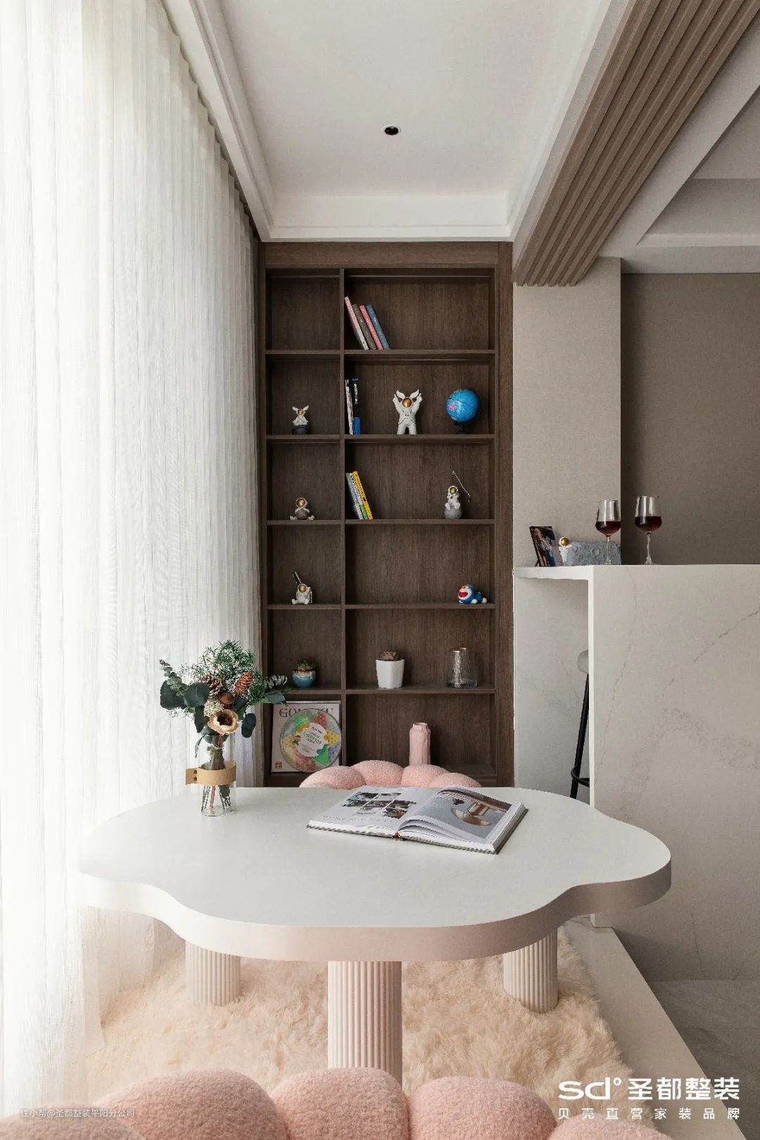 ✔ 可以利用这片区域规划一片开放式阅读区,定制整墙柜子,收纳下海量书籍。阳台一般光线有些强,建议装上可调节光线的百叶窗,或者增加一层纱帘,避免阅读时阳光直射眼睛。