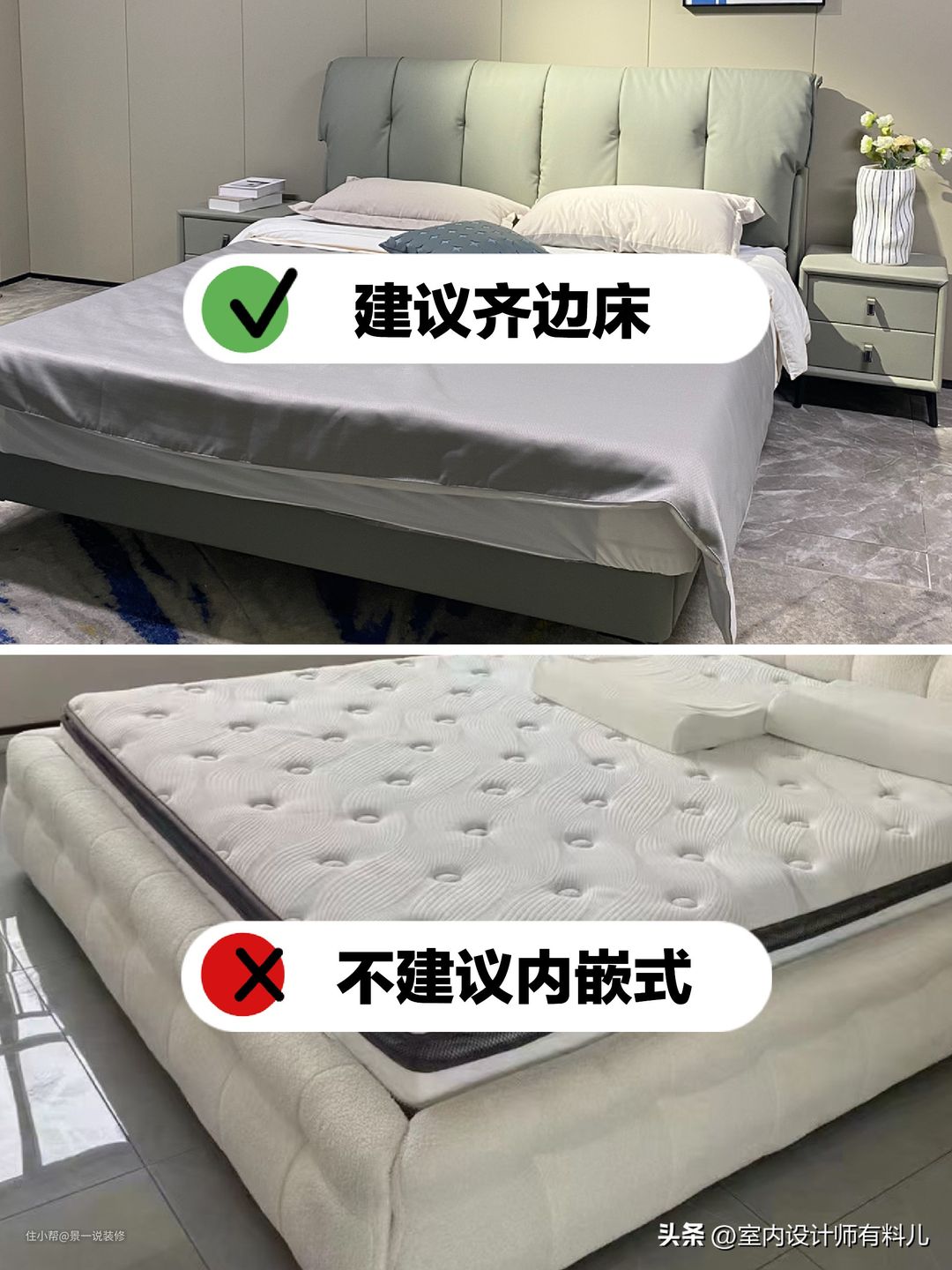 所以,内嵌的围边床最好是别买,可以选齐边床,齐边床的优势是省空间,易清洁,更安全,款式也多样。
