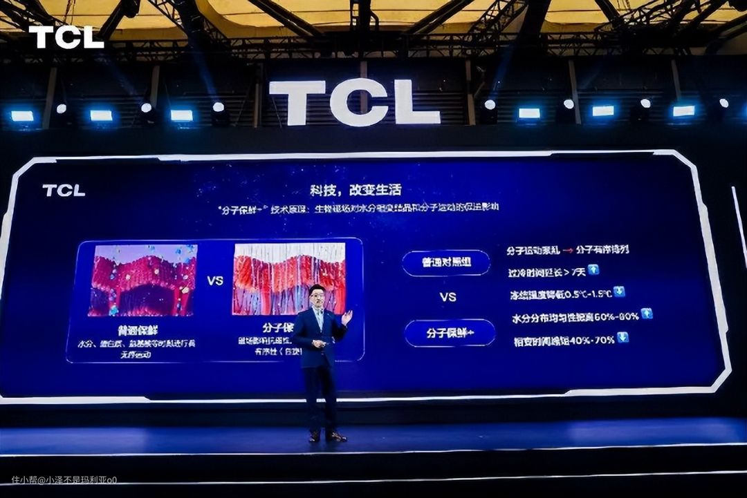 今年的AWE展上,TCL发布了全行业首创的分子保鲜+技术, 这项技术是通过研究不同磁场强度对食材中水分子过冷效应的影响,找到磁场强度、过冷温度以及营养留存率这三条曲线重合的最佳平衡交叉点,使肉制品、果蔬、面制品等相变时间缩短 40%-70%,冻结温度降低 0.5-1.5℃,从而实现更均匀的水分保持,有效减少食材的干燥损耗,大幅延长食材的新鲜时间。
