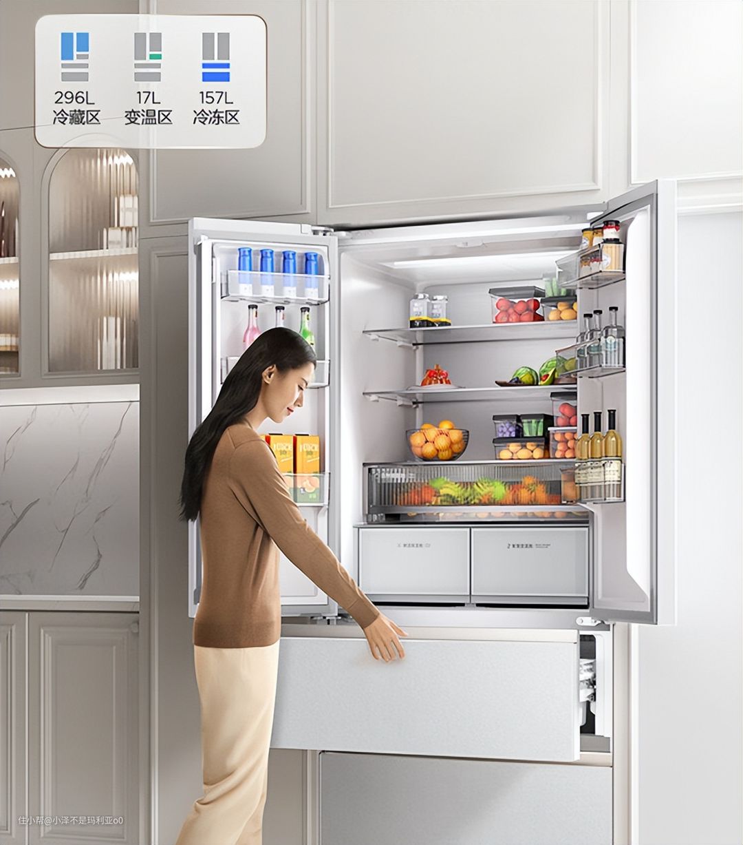 540L的超大容量加上法式格局,让空间利用更加合理。19个精细化分区,食材储存更科学;加大加宽的抽屉设计就是放进去一只羊也能轻轻松松~