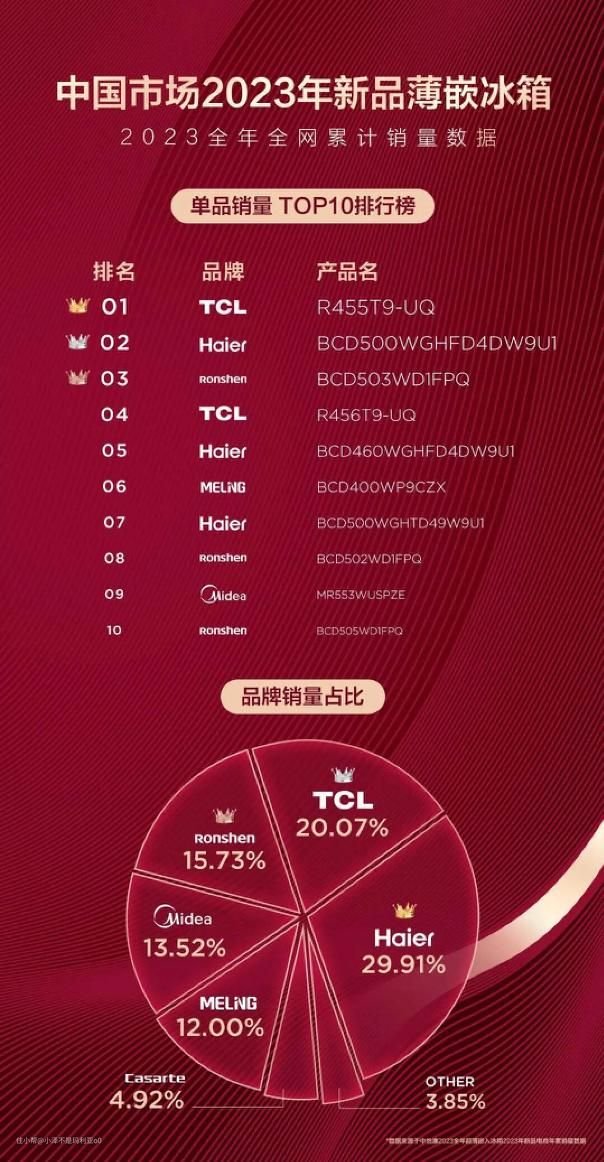 提起嵌入式冰箱的品牌,就不得不提到各家大厂在这个细分领域的占有率,根据中怡康中国市场2023年新品薄嵌冰箱全年全网累计销售数据显示,TCL,海尔,容声稳居销量榜前三,尤其是TCL,凭借着爆款单品薄嵌T9冰箱销量更是遥遥领先,这款冰箱也被誉为是全网zui值得购买的一款薄嵌冰箱。