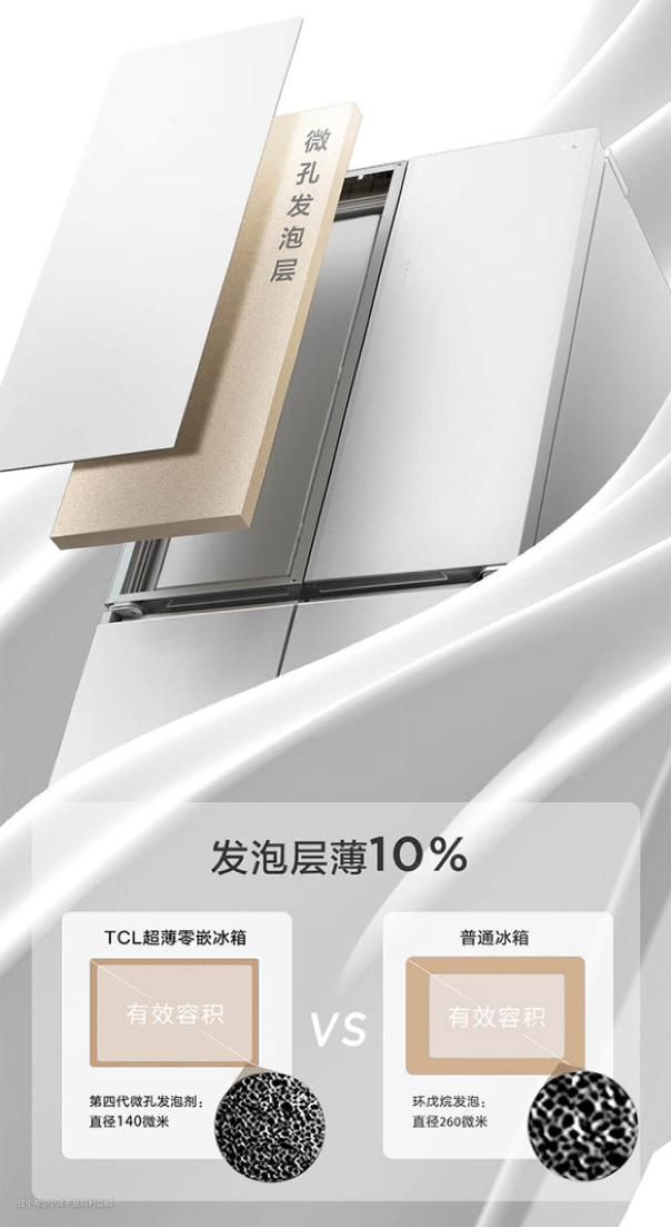 只有不牺牲容量大薄才是真的薄,TCL超薄零嵌冰箱均采用了第四代微孔发泡技术,创新采用微孔发泡层和真空绝热材料,提供高强度绝热性能,同等容量下机身更薄,保温隔热效果更好。