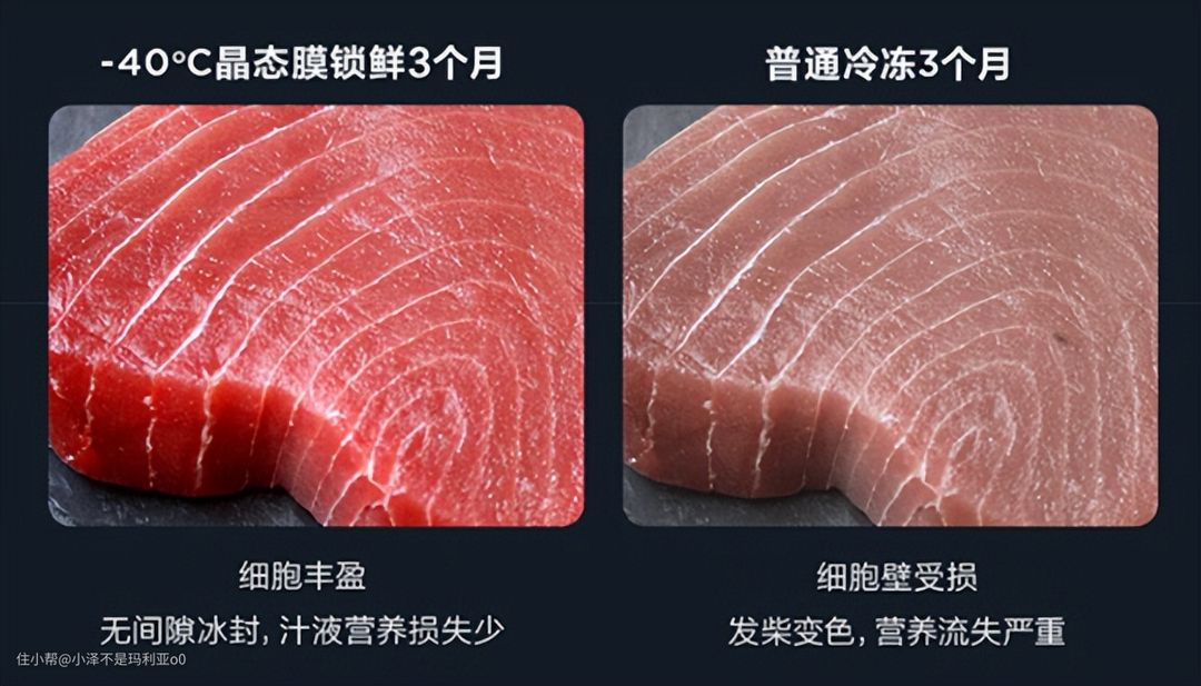 大家都知道,远洋捕捞海产品有两种储存办法,一种是熟冻,就是捞上来直接煮熟再冻起来,操作简单,但是海鲜鲜味损失较大。另一种就是急冻保鲜,通过超低温让海鲜直接冻结,形成冰壳保鲜,鲜度会保留久一点。TCL采用-40℃细胞级冷冻技术,通过超大的冷冻容积急速穿越冰晶带,在食材表面形成一道晶态锁鲜膜,锁住鲜肉本身水分营养,屏蔽外界细菌干扰,留住最初的新鲜海味。保存食材鲜味时间更久,营养流失更少,约等于让你有了海捕急冻保鲜的能力。
