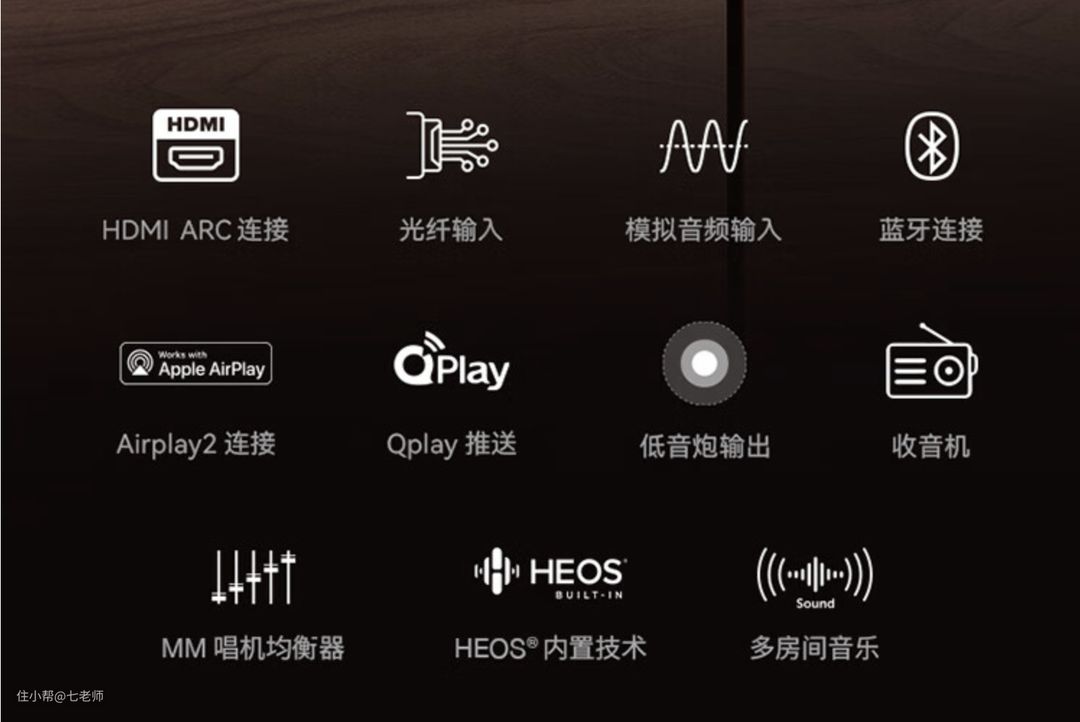 这套系统支持HEOS多房间音乐系统,能够通过手机APP轻松控制,实现全屋音乐共享。同时,它还兼容多种音源输入方式,包括Airplay 2、QPlay、蓝牙等,无论是流媒体音乐还是CD唱片,都能提供高品质的音乐体验。