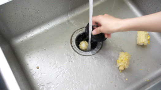 ▼平时做饭做菜中,有很多蔬菜或是水果的边角料需要切下来扔掉,这些蔬菜水果一般都会比较硬,算是厨余垃圾的“骨干”吧。玉米是我能想到的平时生活中常用食材中最硬的了。我直接用刀把玉米棒子切成50mm左右的长度,扔进贝克巴斯E60 Pro中进行处理。