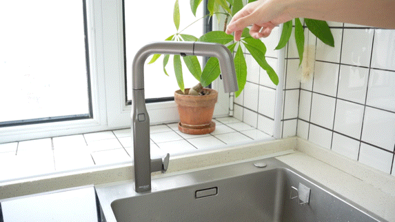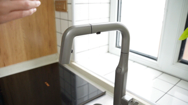 ▼F05 Pro跟大多数厨房龙头一样都是配备了抽拉功能的,抽出水龙头后自动开始出水,放回后自动关水,抽出的龙头可以达到45厘米,平时用来冲洗洗菜盆拿起来就用,十分顺手。