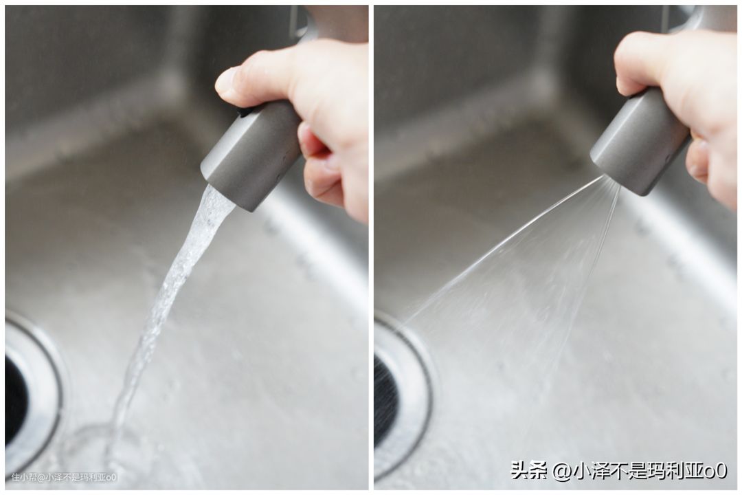 ▼按压龙头前方的按钮,就能一键切换花洒模式,扇形的高压水枪冲洗碗碟上的油渍超级方便,由于水珠足够细腻,冲洗时污渍也不会到处飞溅。