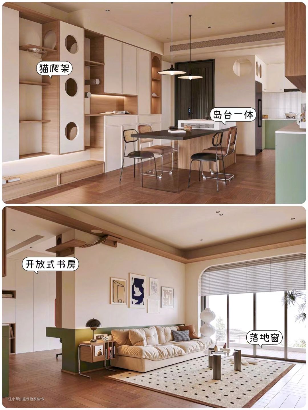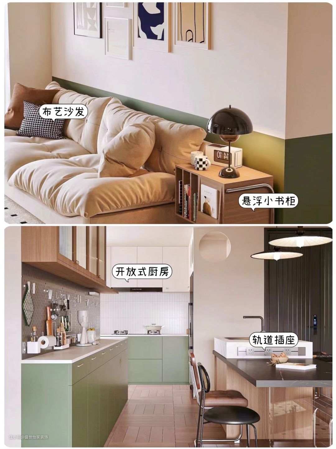 🎈色彩搭配:客厅以中性色调为主,黄色沙发成为亮点,与深色木地板和白色落地灯形成鲜明对比。而厨房则采用绿色和白色搭配,清新而不失稳重。这种色彩搭配既符合中古风的特点,又让整个空间更加有层次感和质感。