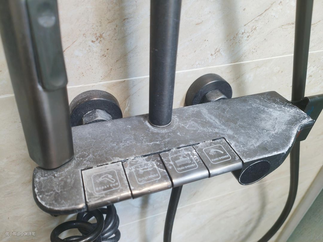 ②就是我前面刚刚吐槽过的竖杆!杆子和墙面之间有道缝,这道缝里经常会残留水垢。水垢本来就难擦,这里的空间还小,抹布根本伸不进去。
