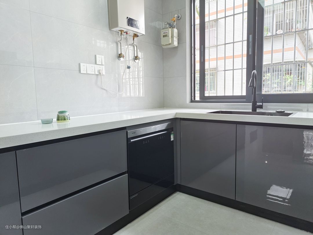 深黑色的橱柜犹如一位沉稳的绅士,散发着高端大气的气息。它与白色的台面形成了鲜明的对比,仿佛是黑与白的交响曲,在空间中奏响。这种对比不仅使厨房的层次感更加突出,还带来了视觉上的冲击力,让人过目难忘。