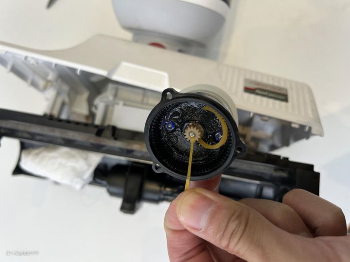 为了搞清楚故障在哪,先拆下前滚刷的传动部分,左侧金属齿轮是和马达那边连接的,用手拧了一下,发现输出轴也跟着转,问题应该不在这里。
