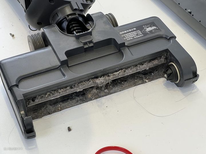 拆卸刷头部分,经过一段时间的使用,吸口粘了大量的毛絮,这也是洗地机常见的问题。