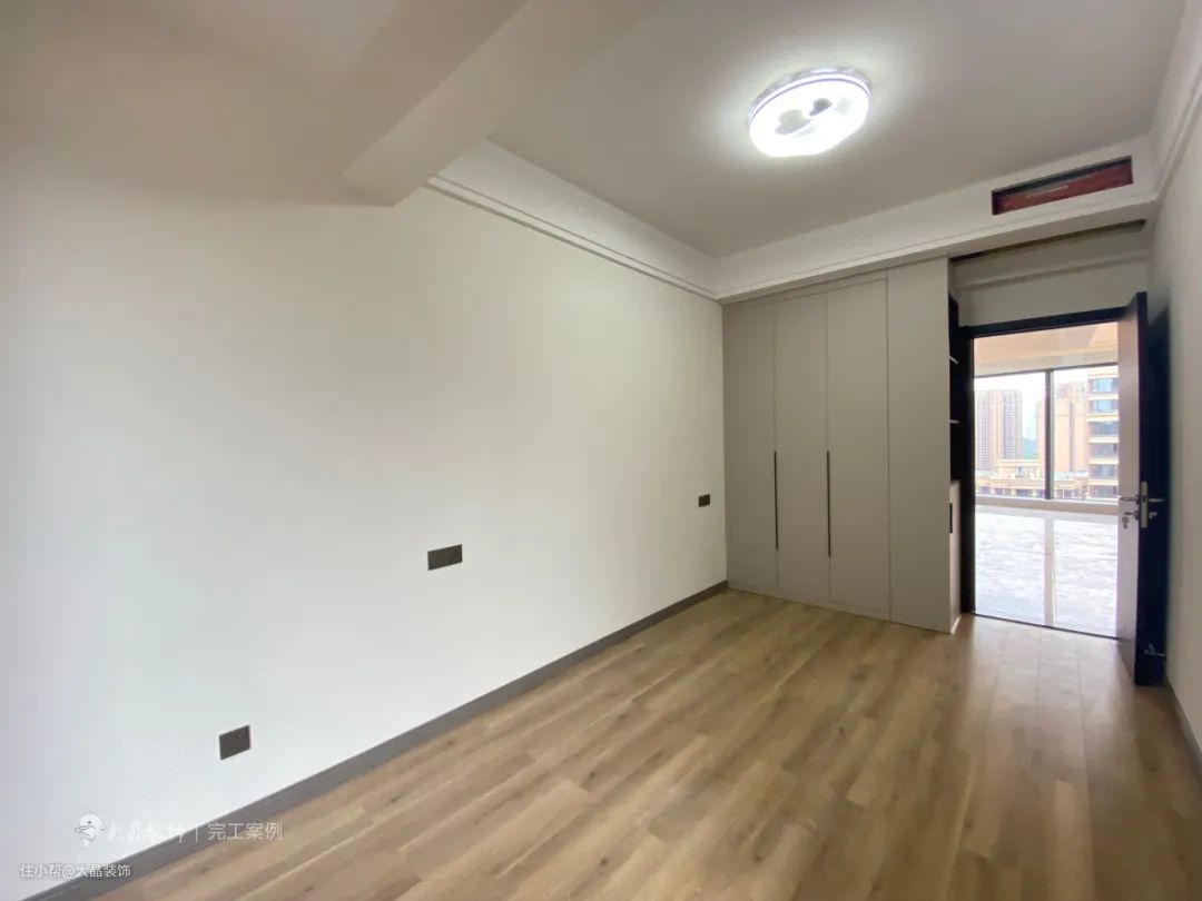 左右两边分别展示两间次卧,左边展示的次卧打掉飘窗增加了室内空间,软装可操作性更强。右边展示的次卧同样为双眼皮吊顶,衣柜置于进门的一面墙,此间卧室没有 选择打掉飘窗,软装进场后铺设软垫,一个非常舒适休闲空间就此呈现。