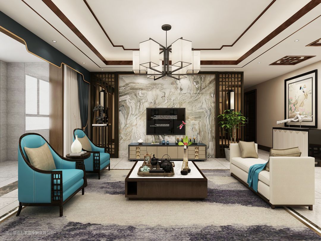 蓝色禅意沙发是客厅的亮点之一,其色彩与整体空间的白色形成对比,既突出了沙发的存在感,又丰富了空间的色彩层次,沙发的造型和材质都充满了中式元素,与整个空间的风格相得益彰