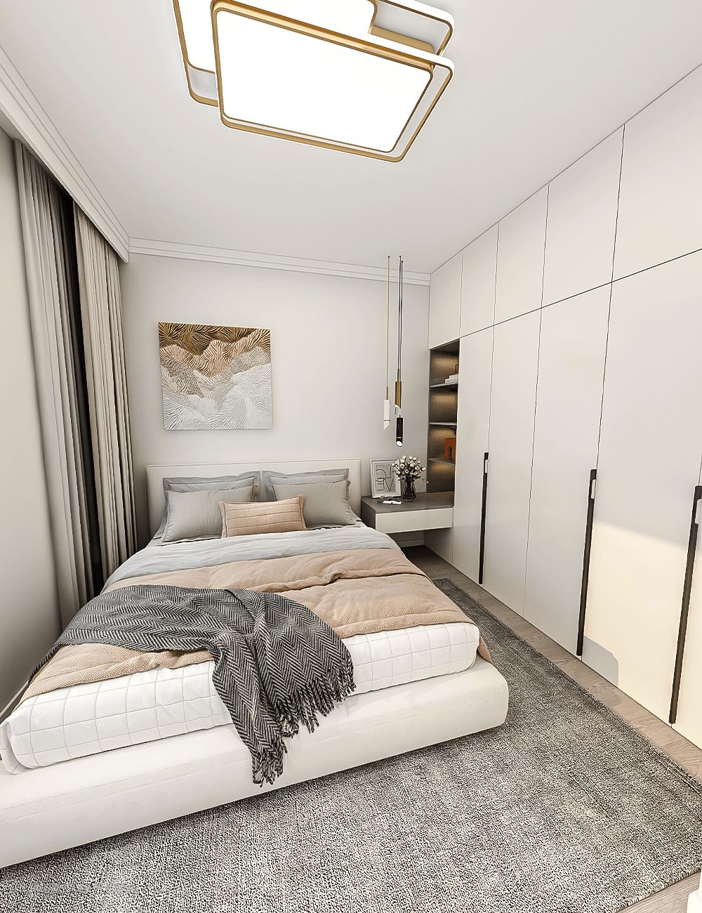 主卧的搭配也沿用了简约的素色。灰白色为主色,只是床品用了藕色的被子和抱枕来搭配,有了这一抹亮色,会显得更加有朝气。