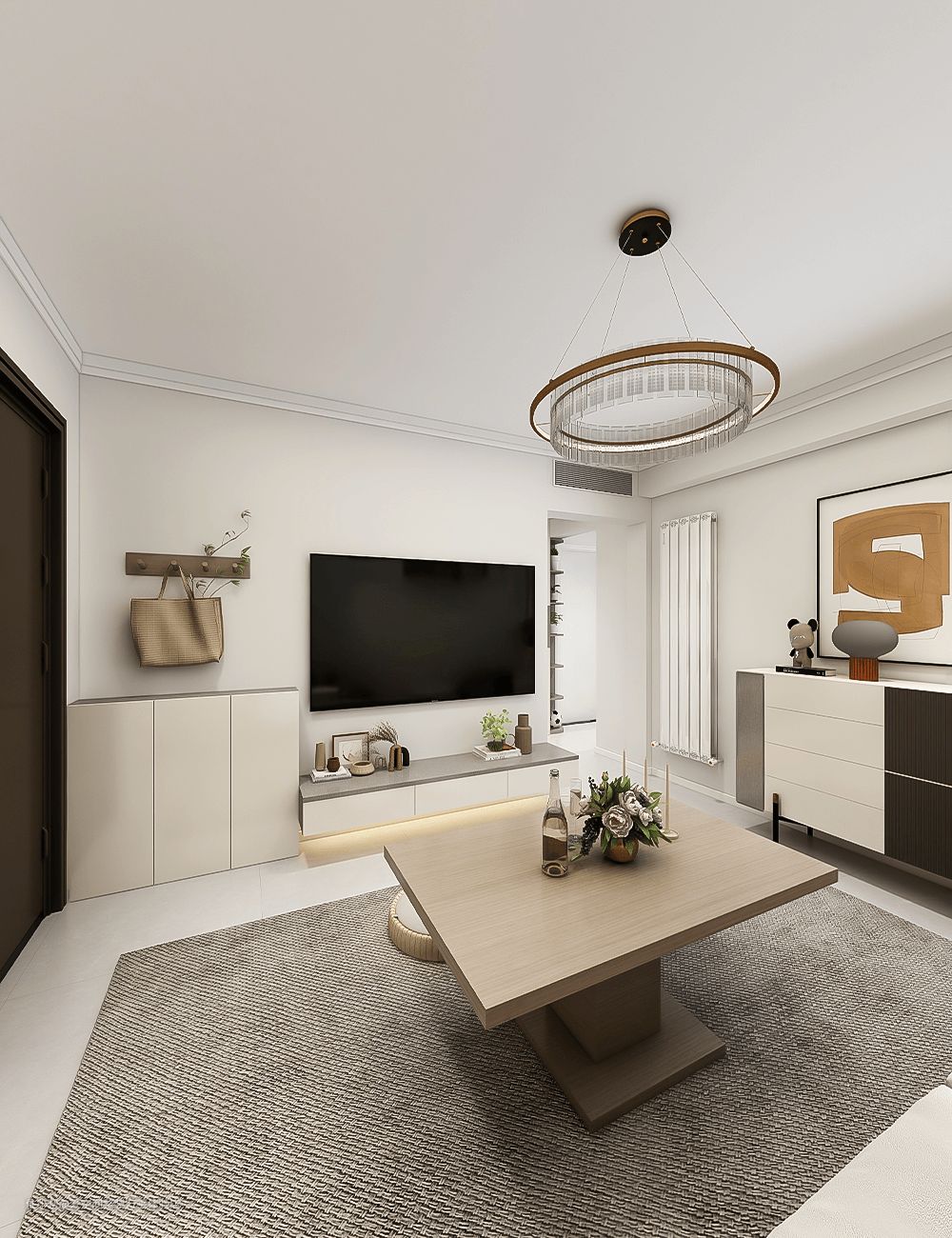 进门的位置做了矮鞋柜和挂衣区,连通电视柜一体化设计,视觉上更加和谐。
