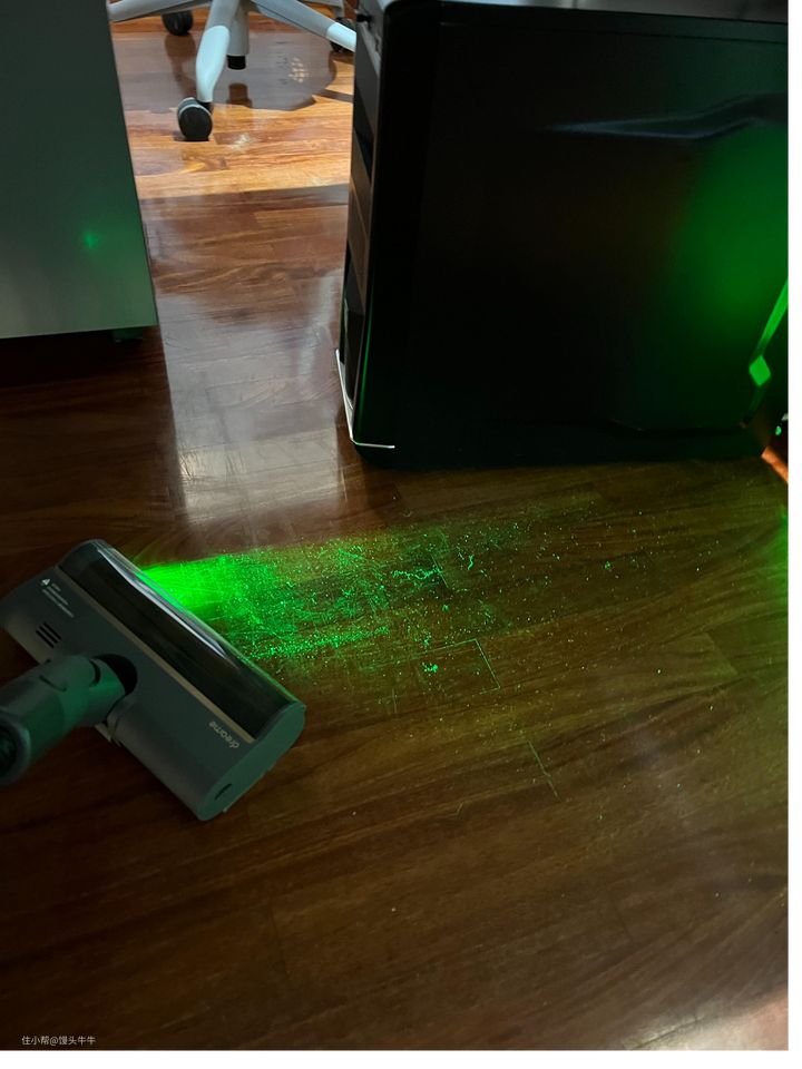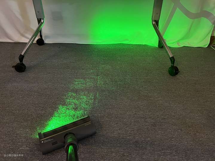 地刷还带绿光显尘,这样的光线比一些激光设计的吸尘照明更护眼,在自然光线下比纯白色灯光可视性又更强,看得更清楚,能更精准的看到那些肉眼看不到的灰尘隐藏在哪里,打扫起来更精细干净。