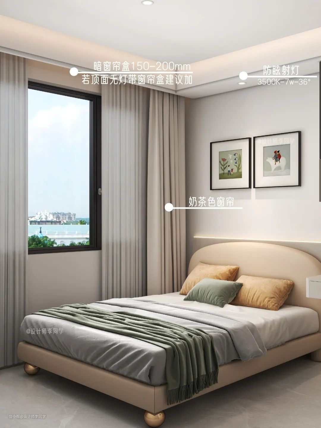 4. 墙面不用做太多造型,简单刷个乳胶漆就好,不想吊顶的,简单做个双眼皮装个吸顶灯也不错的选择。尺寸够就留空隙,不够窗帘就悬空哦,还可以装百叶窗。设计很多种,选择自己喜欢的来抄作业。