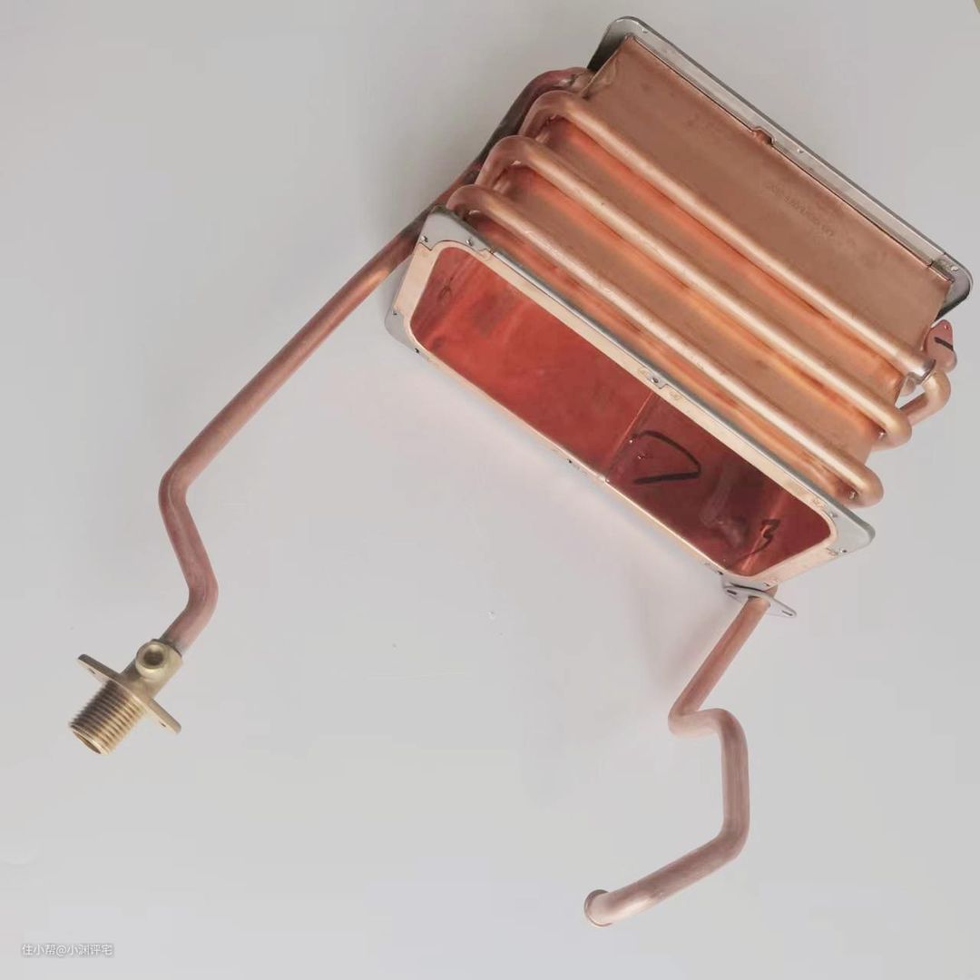 中间方形管理是滚烫的废气,外面一圈细管里是凉水。冷热相交,就会在表面产生大量冷凝水。冷凝水需要排走呀,所以冷凝式燃气热水器下面都会有一个排水口▽