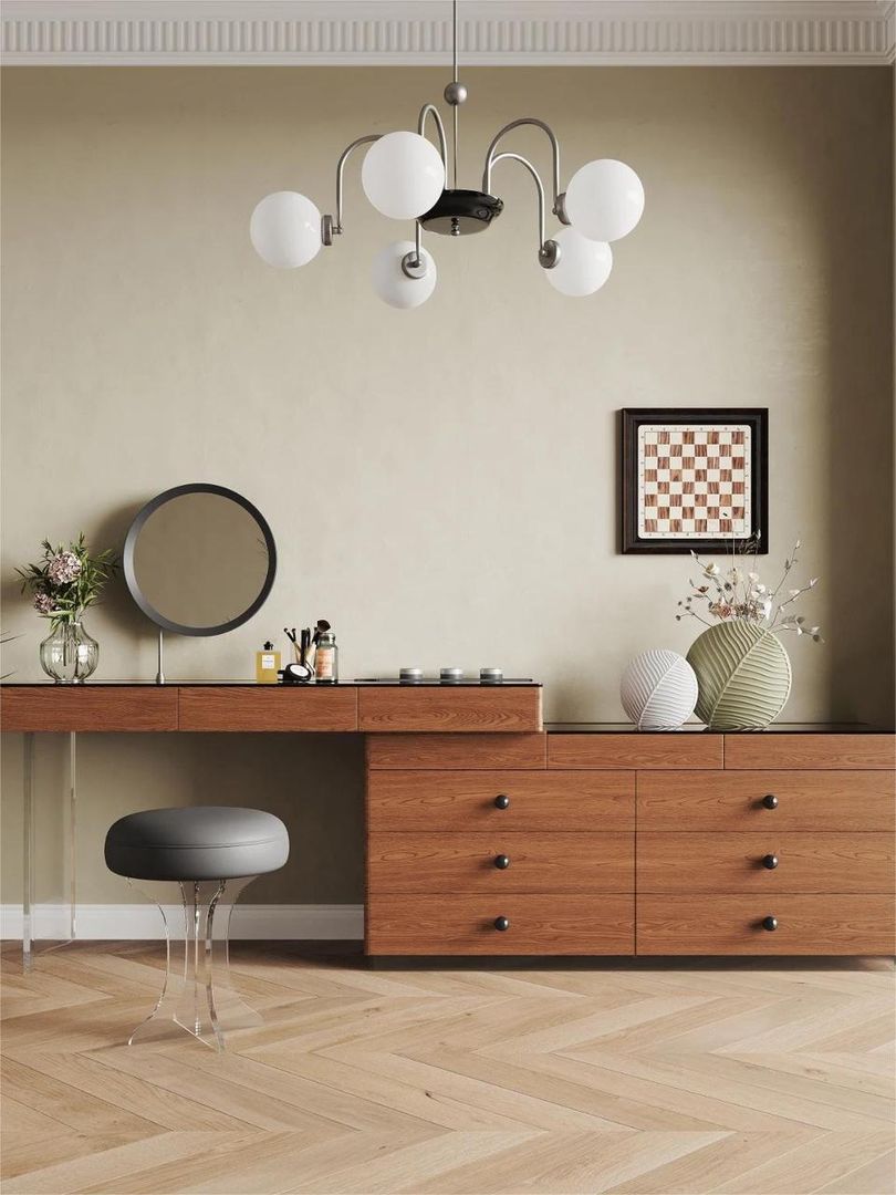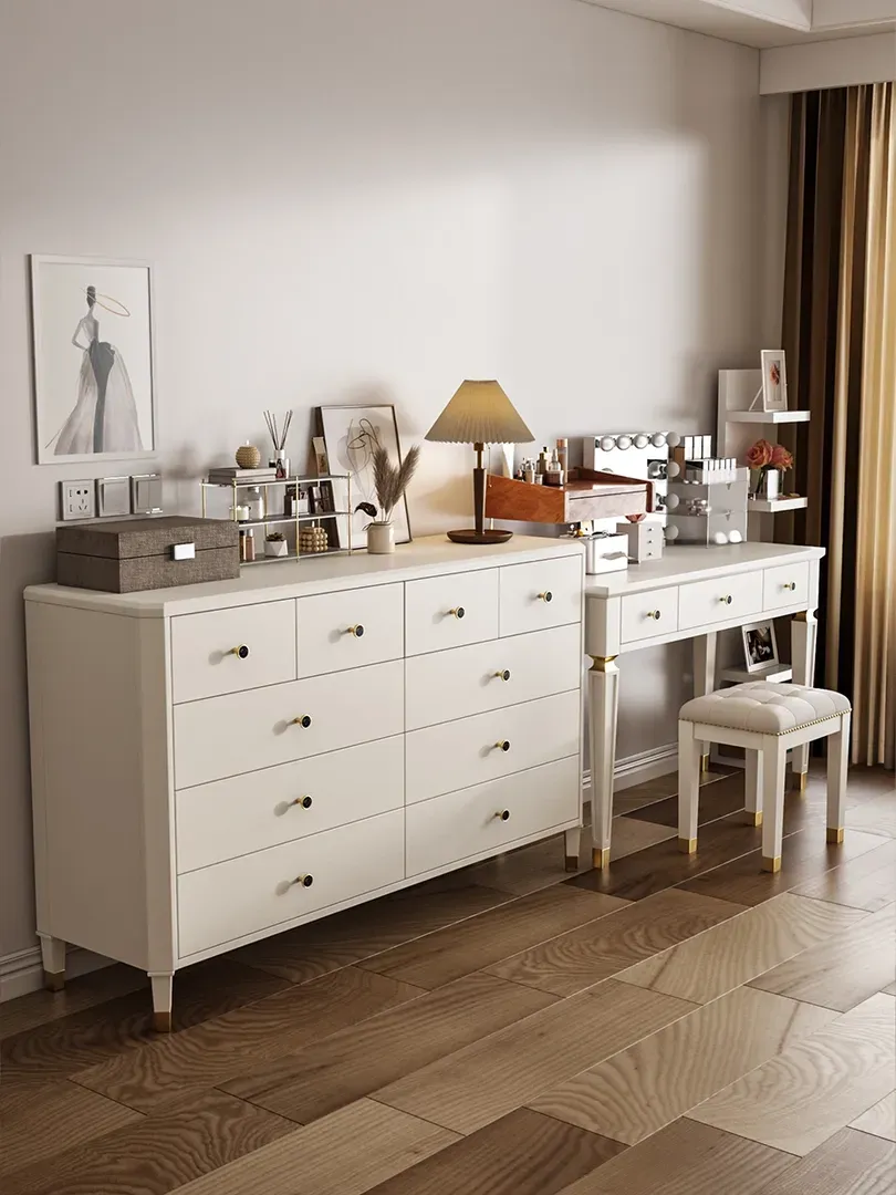 斗柜和梳妆台一体:适合面积较小,但需要梳妆台和储物功能的卧室;选购时注意梳妆台高度和斗柜深度,确保使用舒适且不显得拥挤。