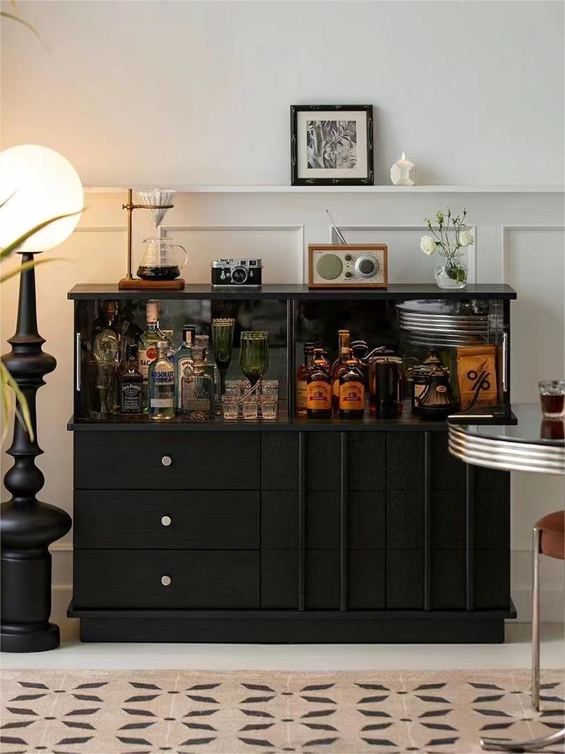 餐边柜是专门为餐厅设计的储物柜,通常具有储物和展示双重功能;通常较宽,有足够的空间存放餐具、酒杯、餐巾等餐饮相关物品,并可能配备有开放式的架子或玻璃门,方便展示精美的餐具或酒品。