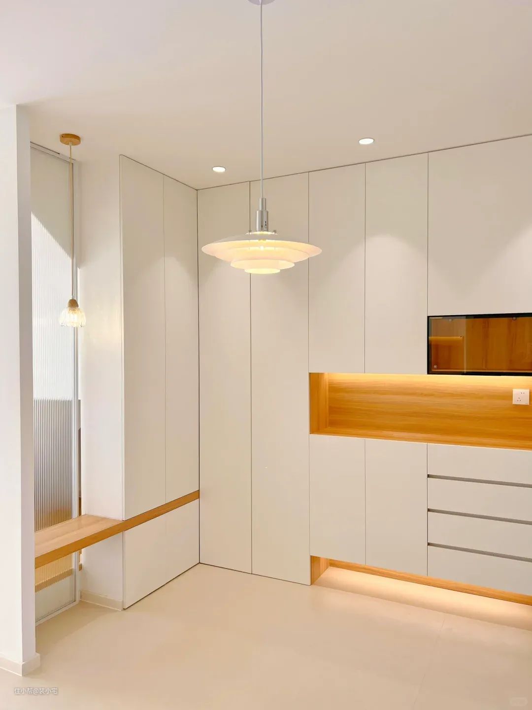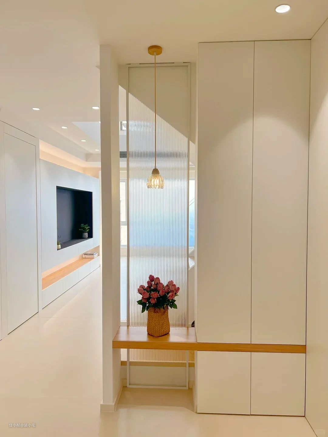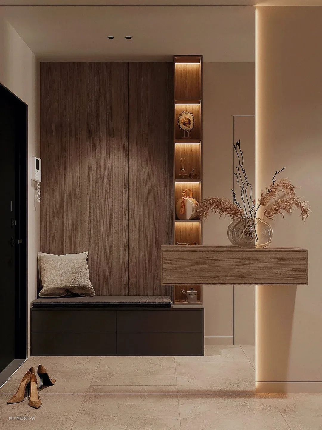 我那朋友的玄关,灯光设计得太到位了。不是直接一个大灯泡照亮一切,而是用了几盏暖色调的筒灯,从天花板上洒下柔和的光线。