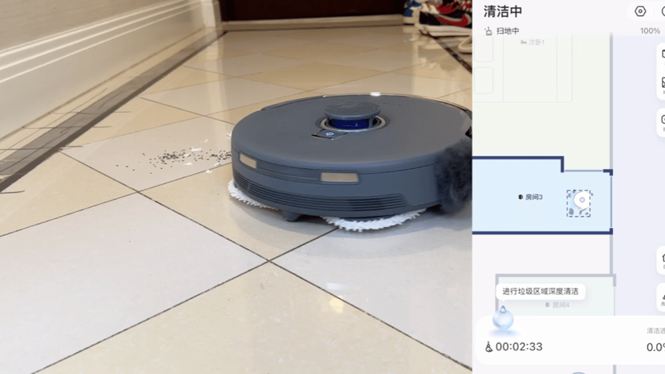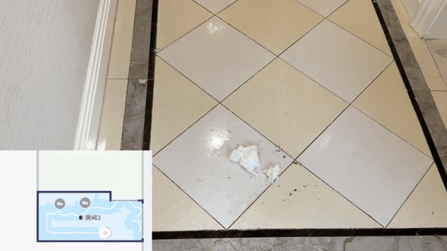 在拖地模式下,机器人主要是为了清理地面上的灰尘或湿渍设计的。但是,当遇到干垃圾,如碎纸屑、食物残渣等非液体污渍时,扫地机器人双目识别到干垃圾后,会自动调整扫地模式,抬起拖布、放下滚刷、开启边刷。