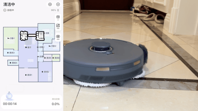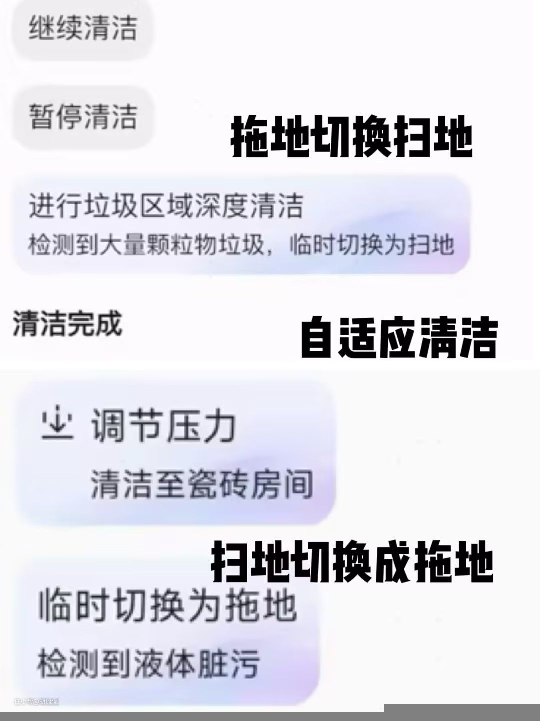 当在扫地模式下遇到大量液体垃圾时,自动从扫地模式切换成拖地模式, 放下拖布、滚刷抬起、边刷停转避免二次污染。看清洁报告也能看到清洁模式的变化。