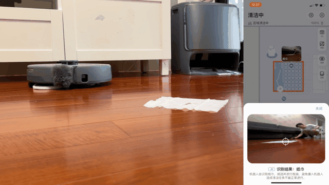 安全贴边绕行「40mm」:保障物品或机器人安全的优先选择,适用于接触后可能影响物品本身或机器人清洁效果的场景,如宠物等。比如一张餐巾纸, 纸巾碎是垃圾会被吸走,但是完整的餐巾纸可能会卷入并卡住风机,云鲸逍遥001可以清晰的识别出来,提早做好避让措施,甚至会收起单侧边刷避免边刷卷入。