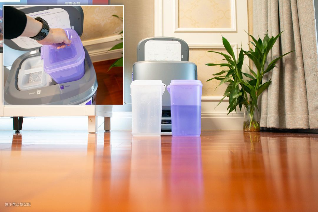 云鲸逍遥001的清水箱、污水箱颜色设置不一样,很方便用户直接放置,而且盖子支持悬停,可以定期清洗水箱后放置晾晒一下。水箱上面有把手设计, 哪怕是女生也很轻易的可以拎起来换水。