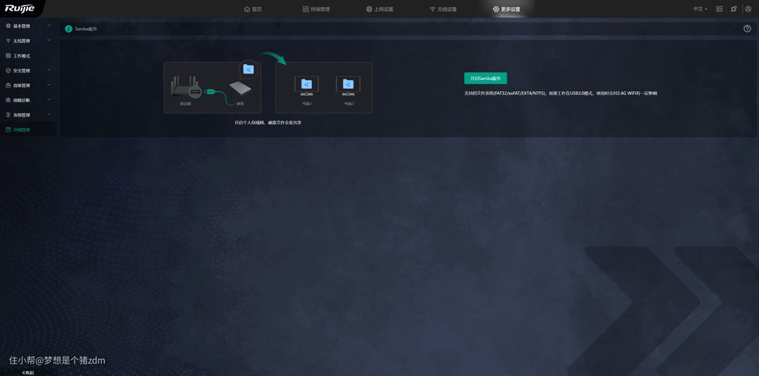 最后就是这款路由器的存储管理了,插上外接移动存储设备后,打开Samba服务,复制访问地址,在“我的电脑”的地址栏粘贴复制的地址,然后回车,就可以查看到外接移动存储设备里的内容,使用起来还是比较方便的,家里如果没有NAS的情况下,可以通过这种方式来获得一个轻NAS。