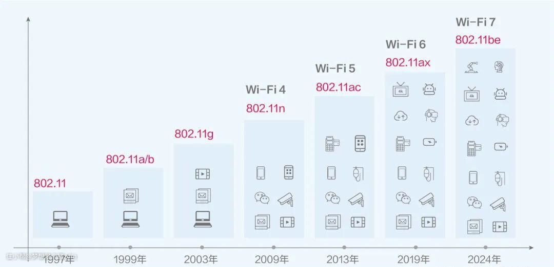 从上面这张表格可以看出,从WiFi 5升级到WiFi 6,用了六年时间,而从WiFi 6升级到WiFi 7,只用了五年时间。