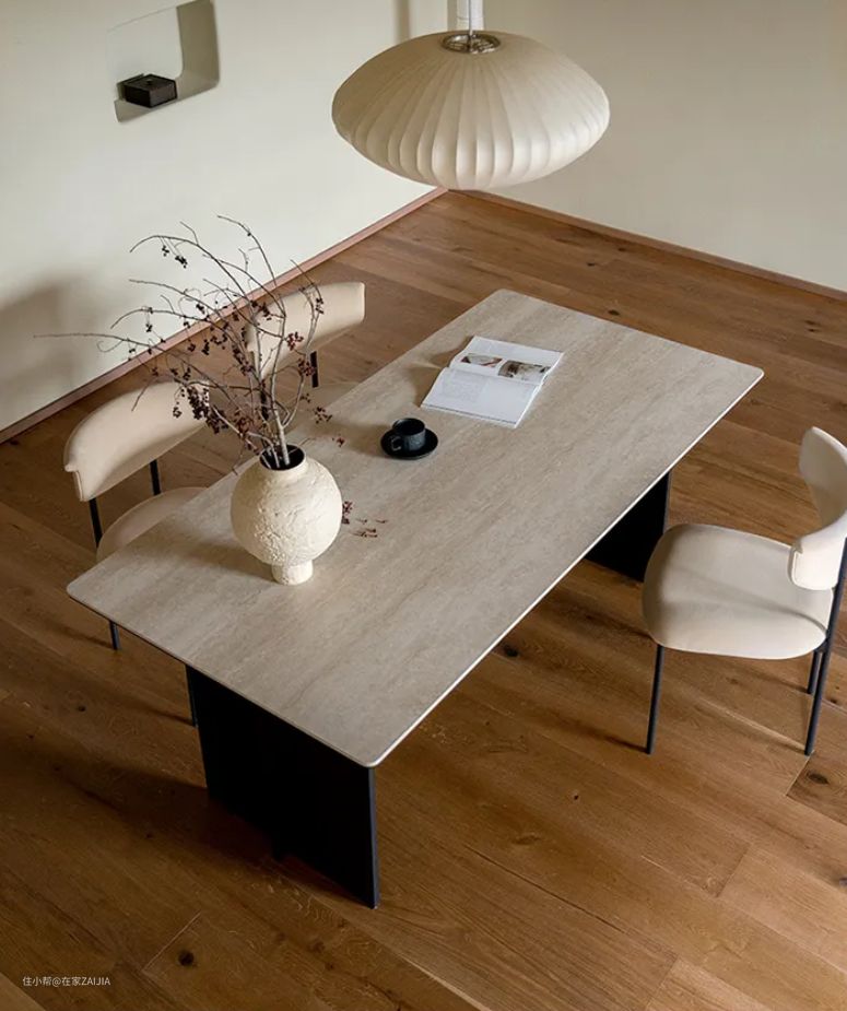 自然风是一种百搭的良药,适用于多种风格,为我们找到一份别样的生活气息。正如舒梵的赤白餐桌,洞石岩板高度还原天然洞石肌理,还做到了舒适的磨砂手感,带来一种看得见、摸得着的自然气息。