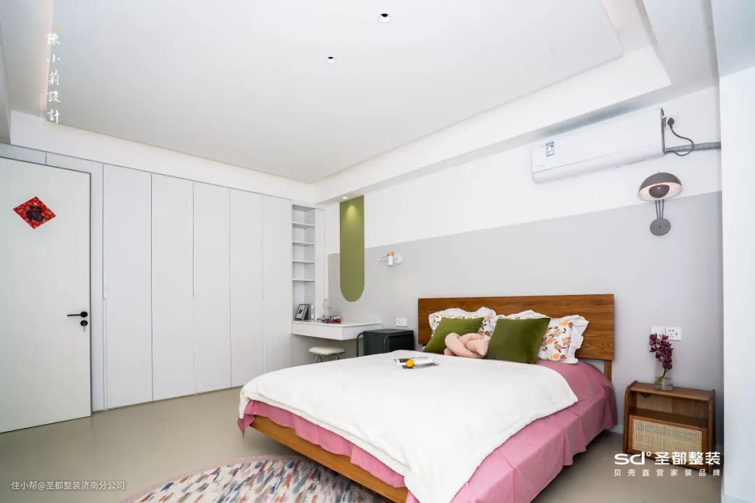 《莫奈的花园》里的床头背景墙跃入了一抹绿色的拱形拼色墙面,是空间里亮眼的点缀,迸发出鲜活又柔软的空间气息。