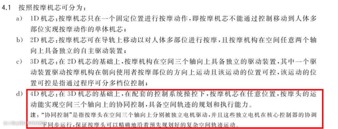 按照技术原理不同,我们可以按照三维世界的逻辑把机芯分成 1D到 3D三大类,同时也代表了三个代际的产品。但随着按摩椅行业的发展,最高 3D的机芯的叫法已经无法满足使用需求,于是出现了 4D机芯。