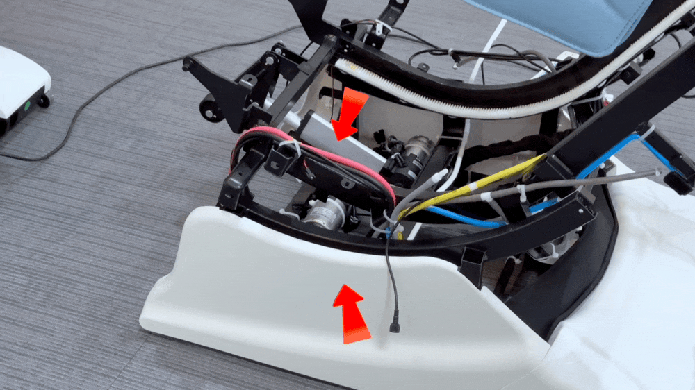而对于这台采用灵动导轨的按摩椅来说,当躺平至下半段时,导轨突然错位,一分为二,成了两条——相当于普通 SL导轨的后半段被「砍」掉一截之后,和前半段叠在一起了,于是向中间内凹的导轨造型就好像被拉直了一样,变得平顺起来 ▲