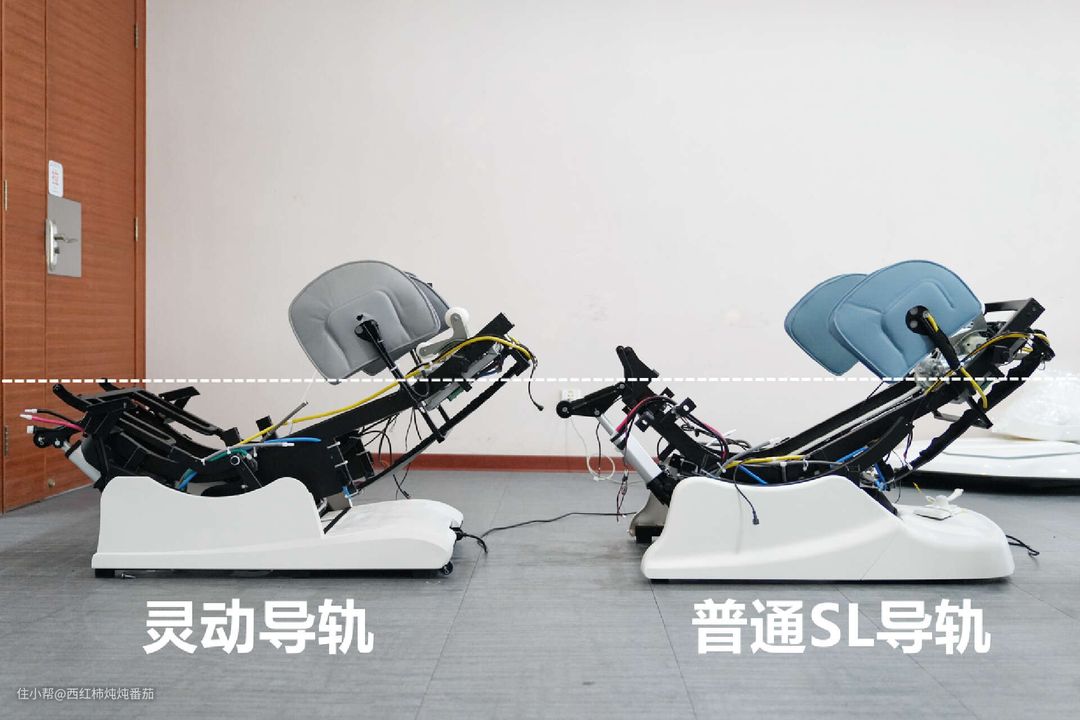 对比右侧传统SL型导轨,左侧的灵动导轨在放平后明显更加平坦,用户躺进去后整个人能得到更好的舒展 ▲