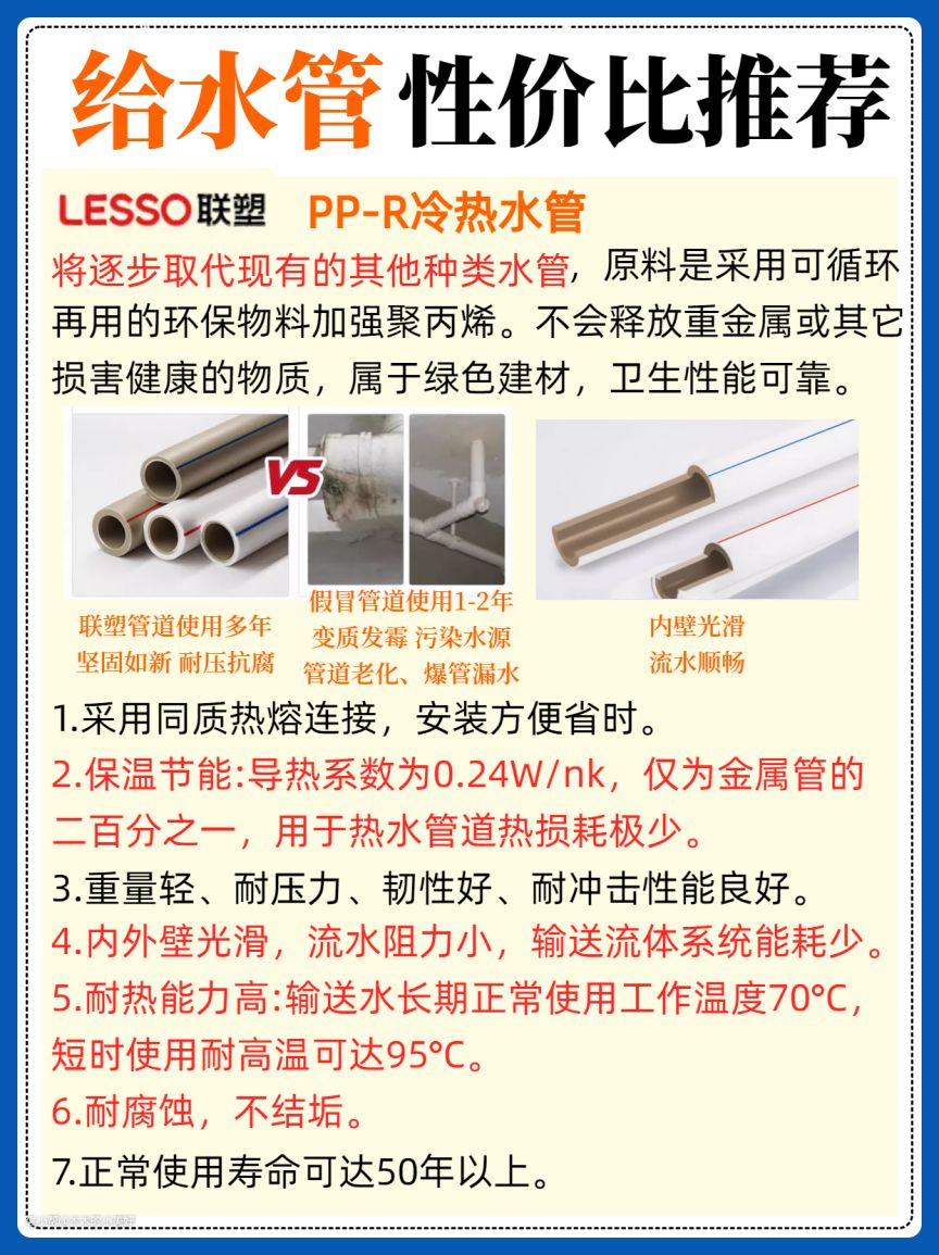 最后由于我家是预埋的水地暖,所以最后综合考虑下选择了联塑PB管,现在入住2年使用下来没有发生一点问题。水电装修管道方面一定要挑专业的管道品牌,比如联塑管道,性能优越,购买安装便捷,以上就是我关于新家装修给水管选择的全部建议,希望能给正在装修的姐妹们带来帮助。